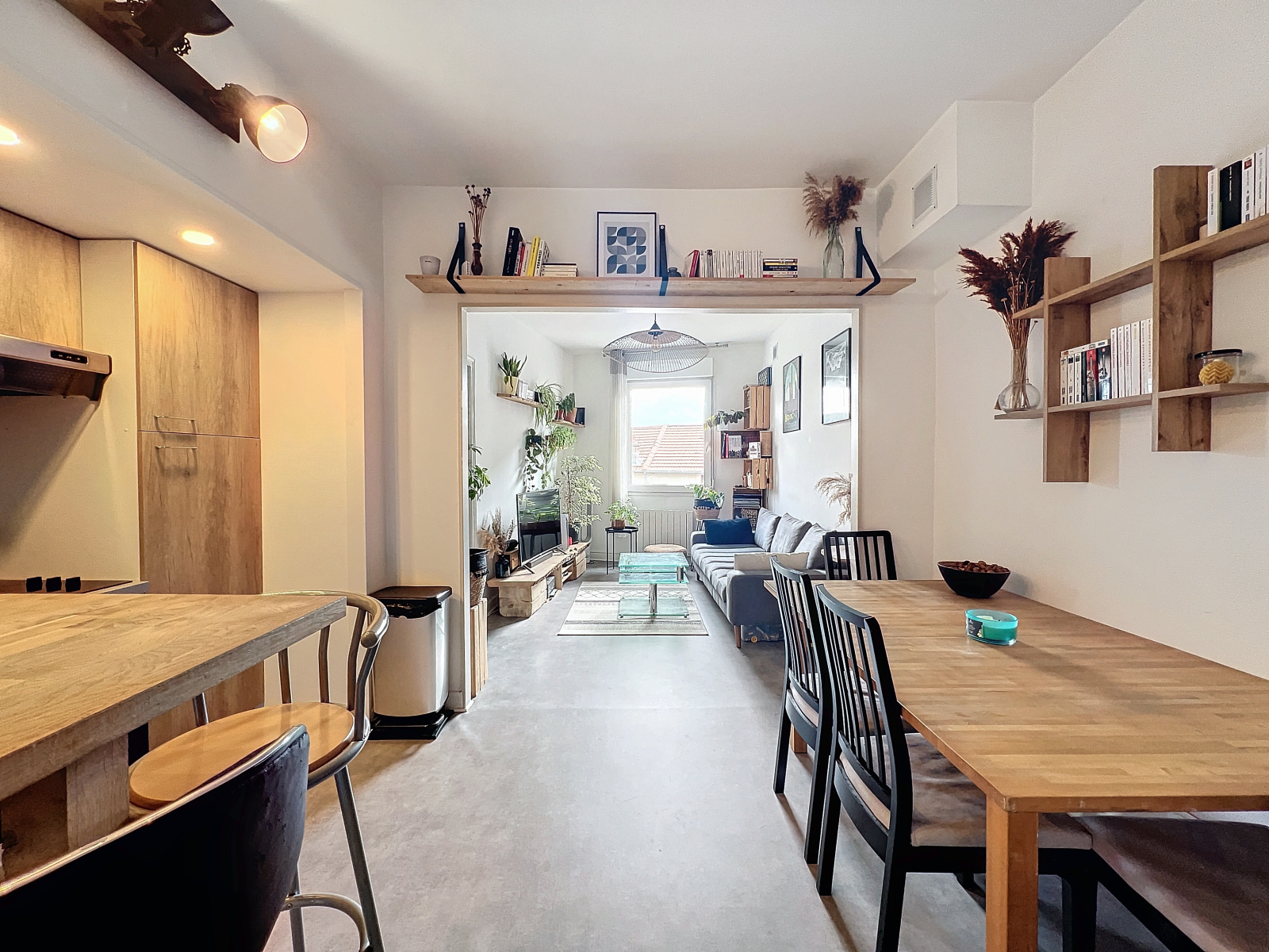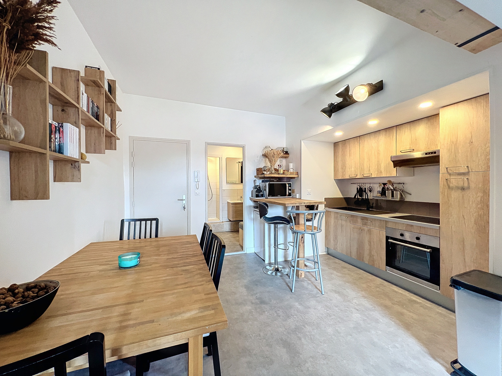 Entrée sur la cuisine équipée séjour. Une grande salle d'eau WC et rangements.