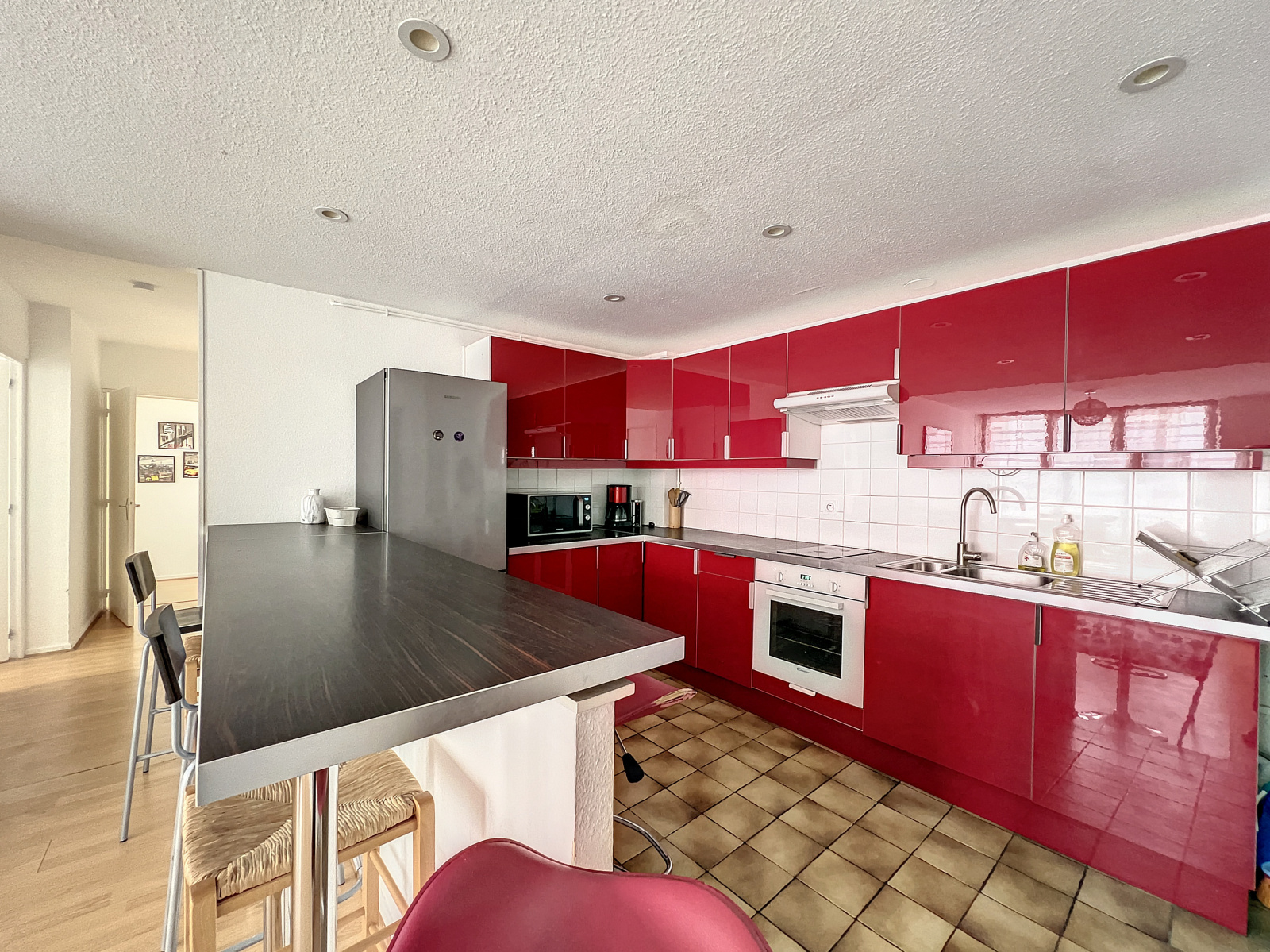 - Une spacieuse pièce de vie ouverte sur une cuisine aménagée et équipée