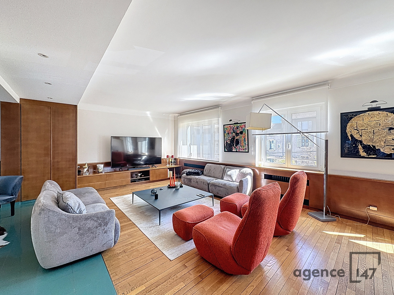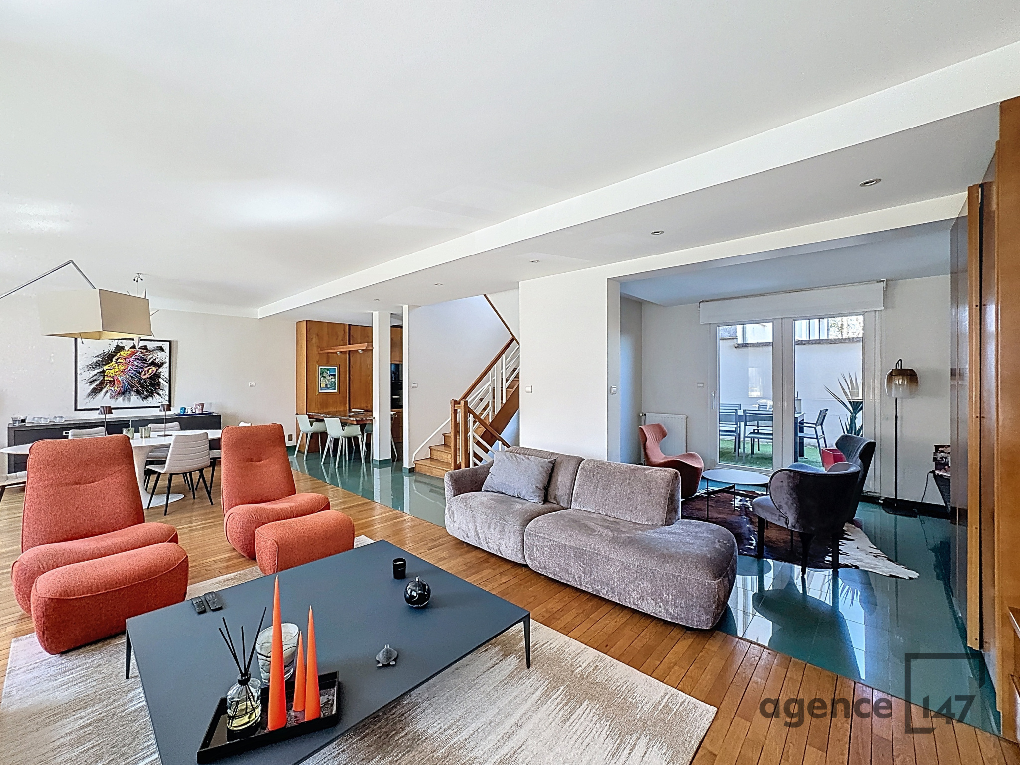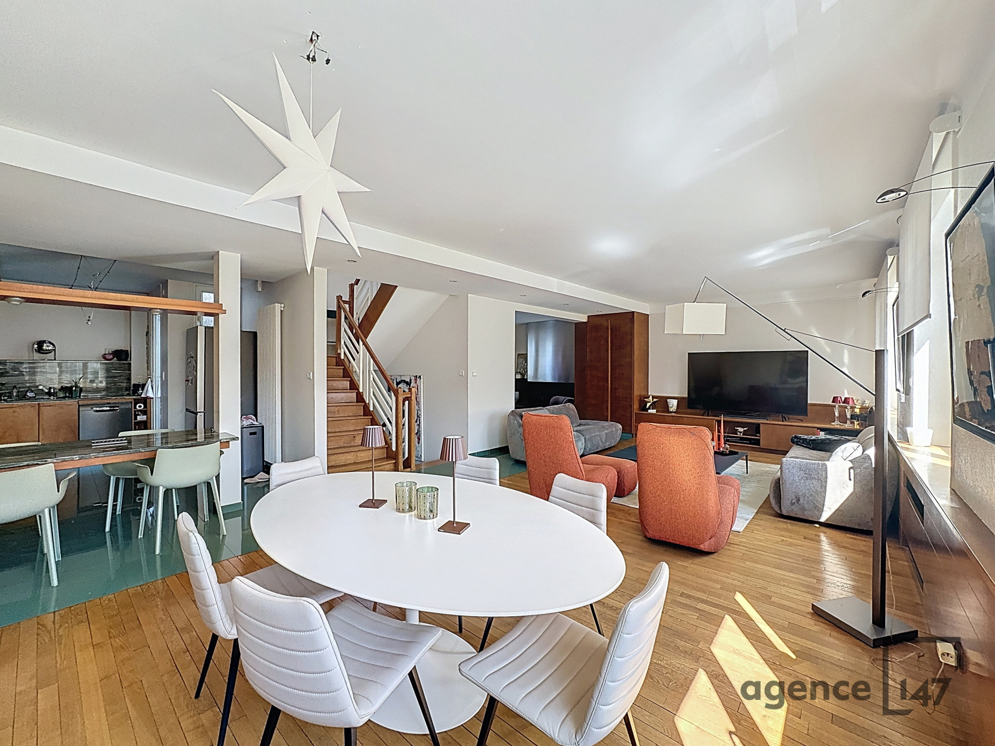 Au deuxième niveau, baigné de lumière, un très grand salon séjour, en double accès à une belle terrasse, cuisine équipée.