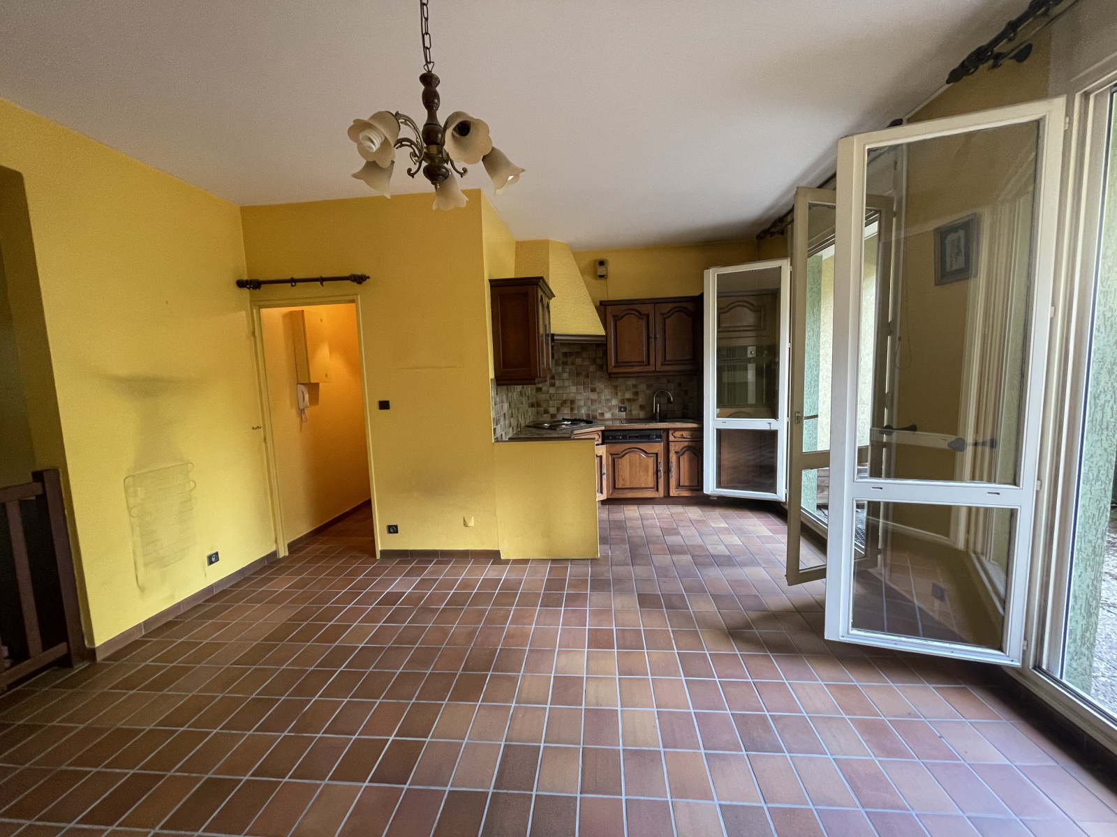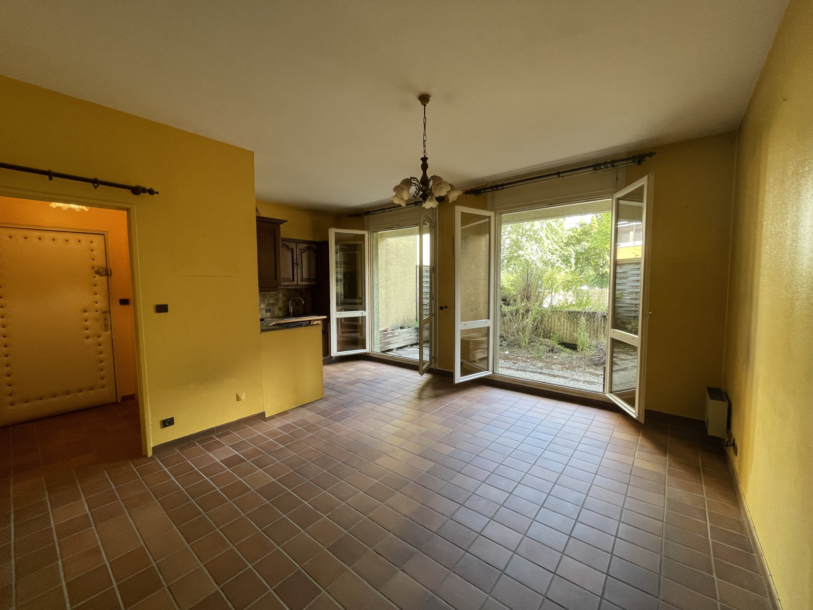 Dans une copropriété sécurisée, un appartement F2 comprenant une entrée avec rangements, cuisine salon accès direct sur terrasse, une chambre accès sur une deuxième terrasse, espace salon.