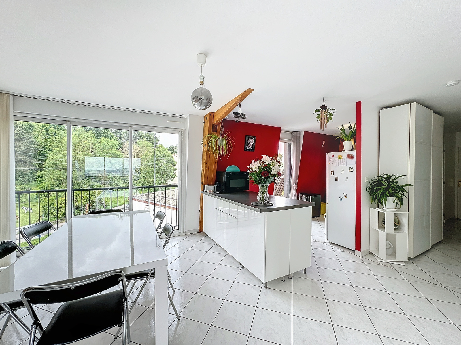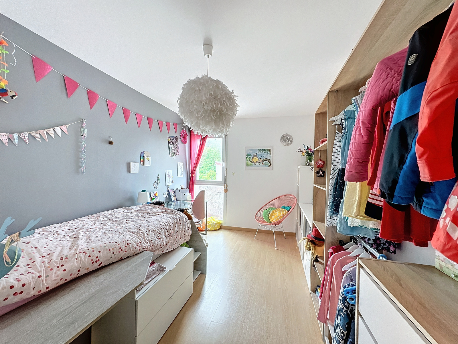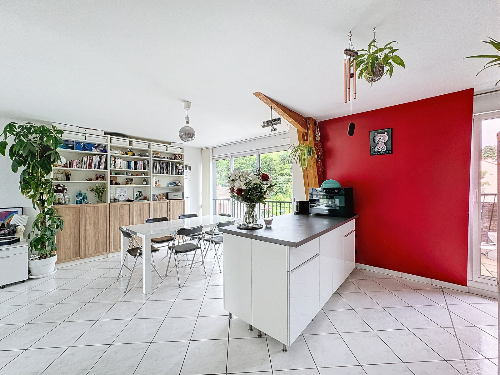 À l'étage, un superbe salon-séjour sur cuisine équipée. Rangements, salle d'eau privative et chambre parentale.