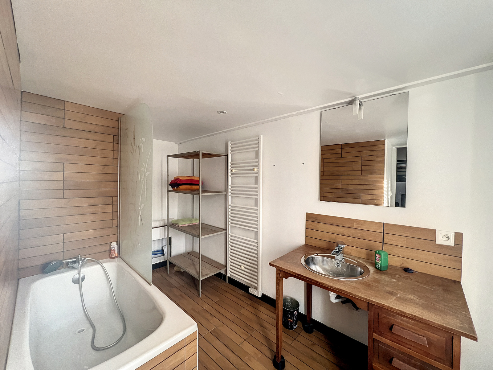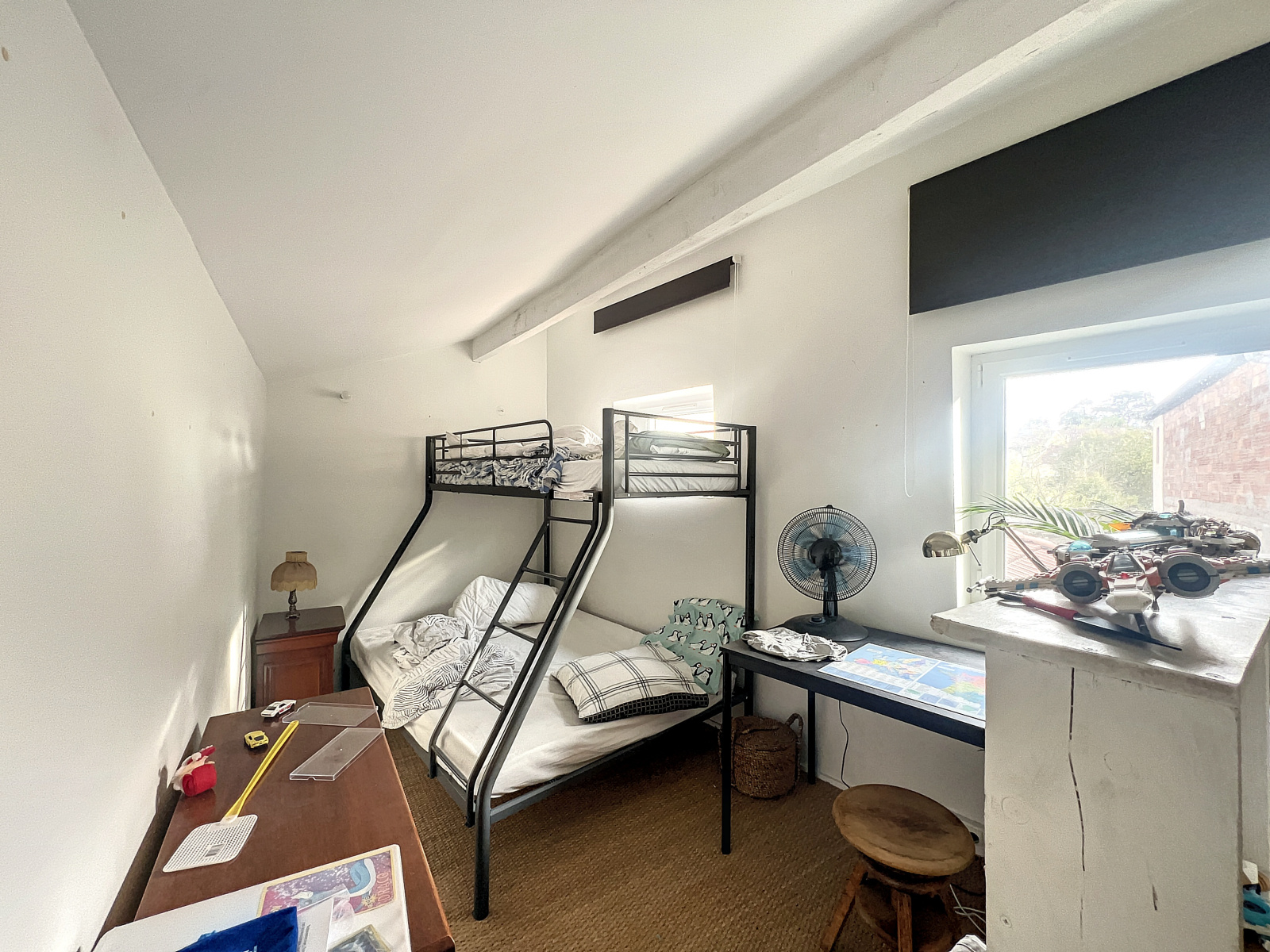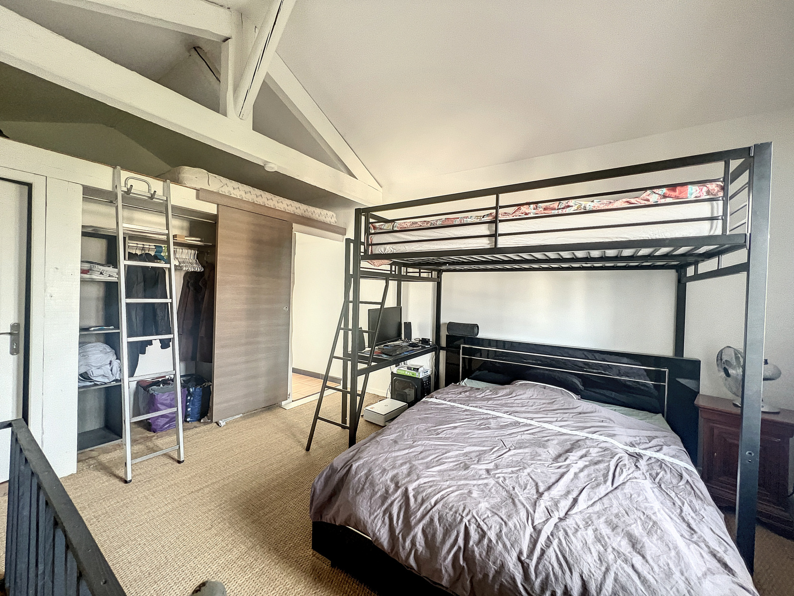 A l'étage : Une grande chambre avec rangements, salle de bains et WC séparés. Une seconde chambre accessible depuis un autre escalier