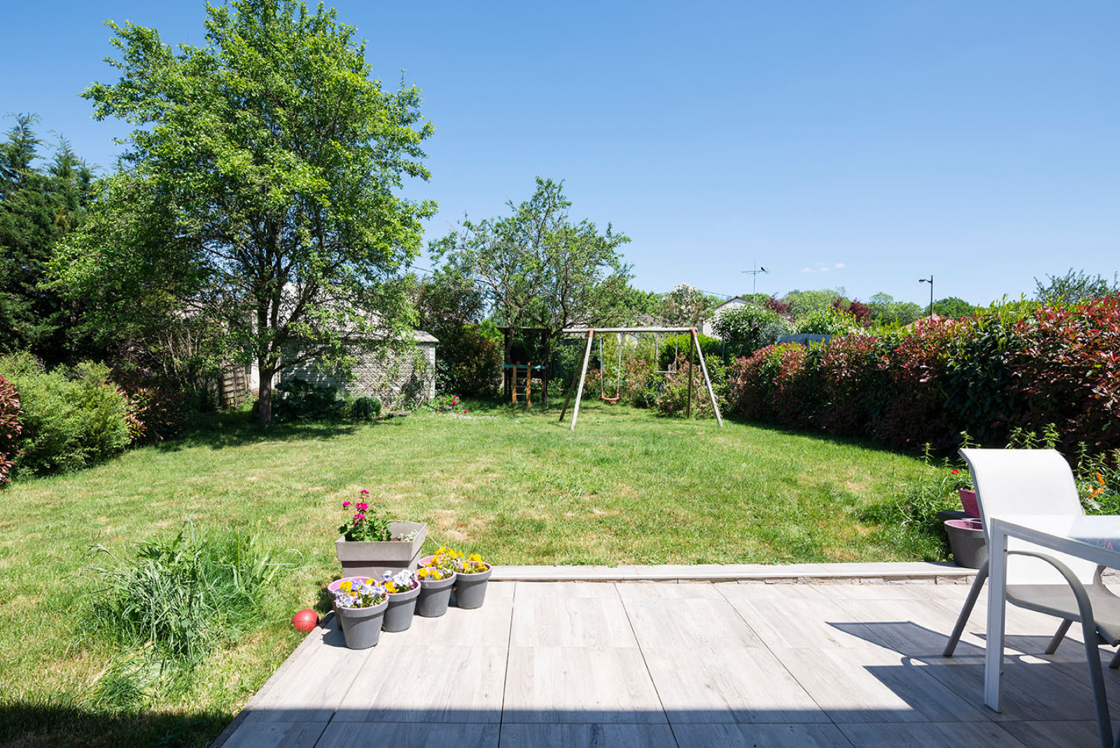 Extérieur : Emplacement véhicule devant la maison, jardin à l'arrière clôturé avec cabanon et abri ainsi qu'une terrasse carrelée.