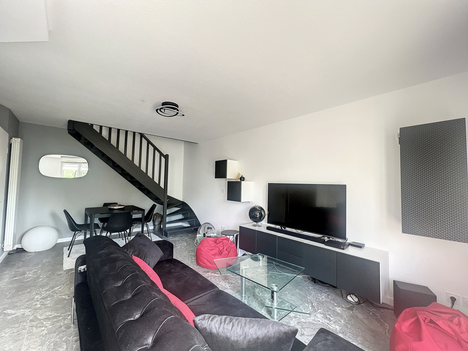 Laxou (54520)Duplex entièrement rénové comprenant au premier niveau une entrée avec rangement et WC, une belle pièce de vie avec cuisine équipée/aménagée donnant sur salon et salle à manger.